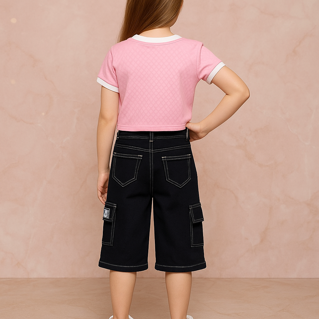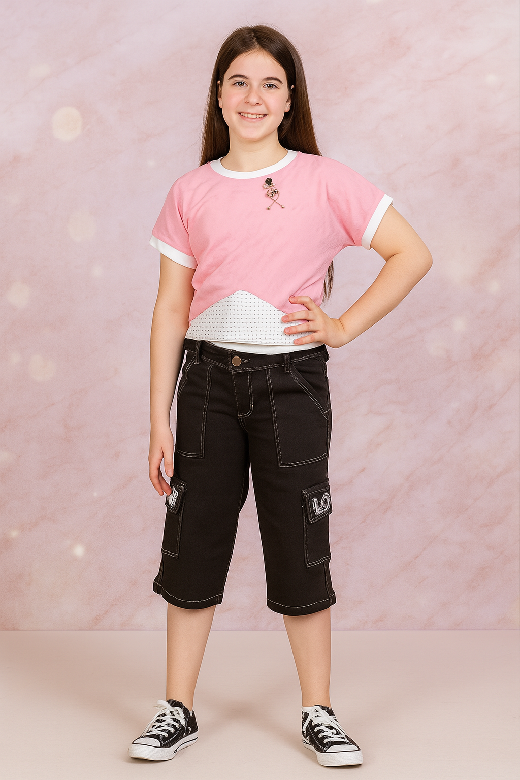 Top: Pink short-sleeve T-shirt with cartoon print and contrast hem